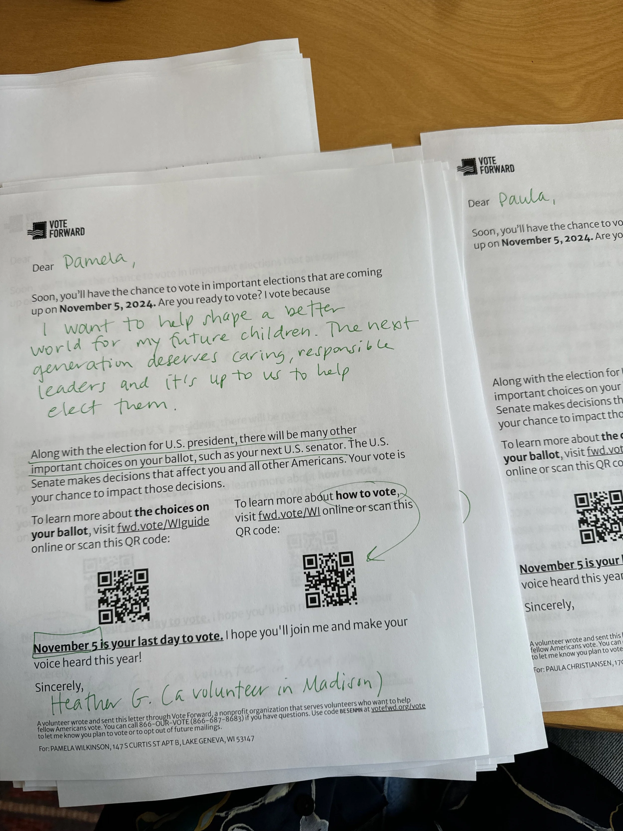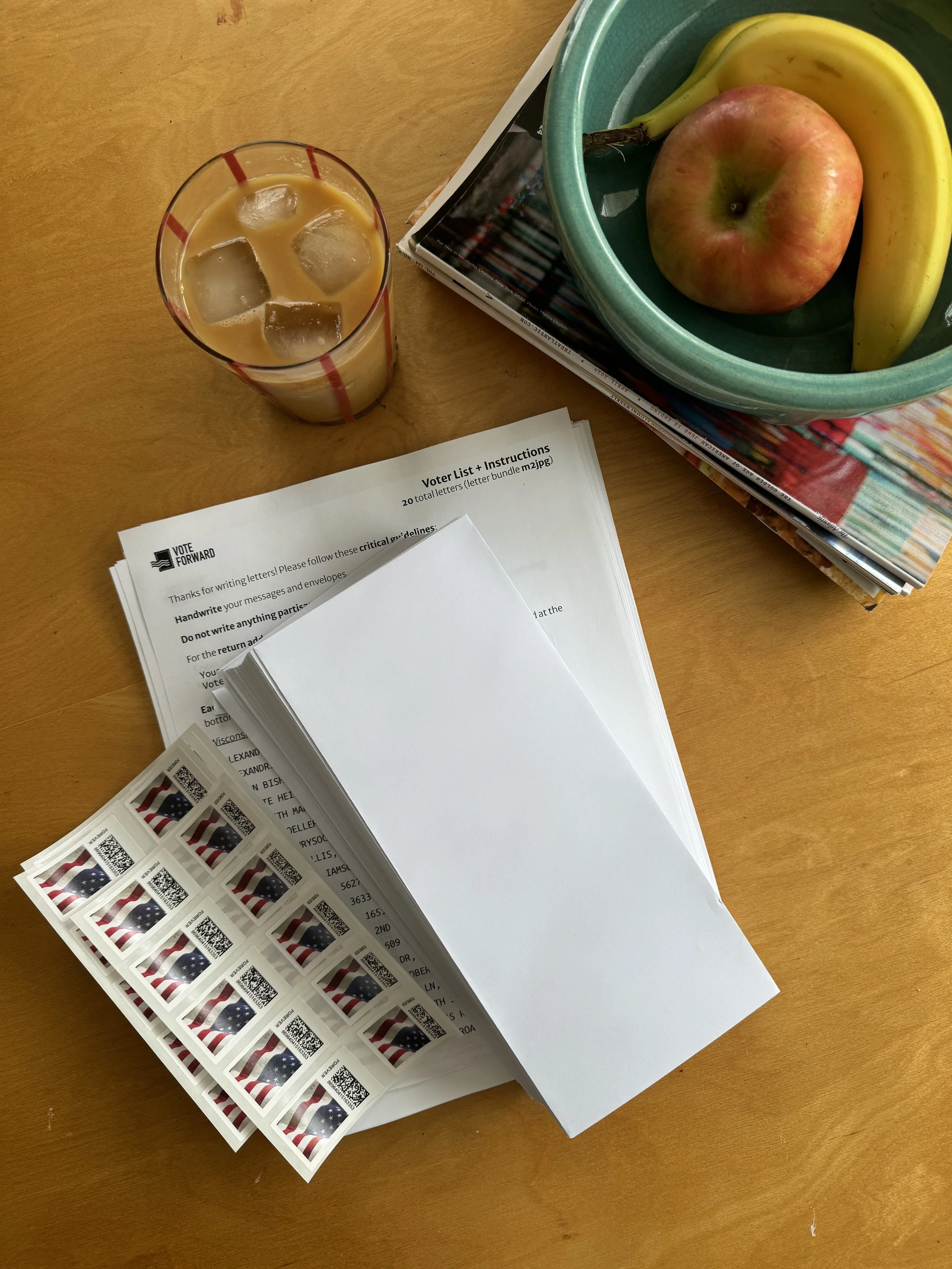 Fill in a short “I vote because” message on each letter, then get it ready to send in the mail